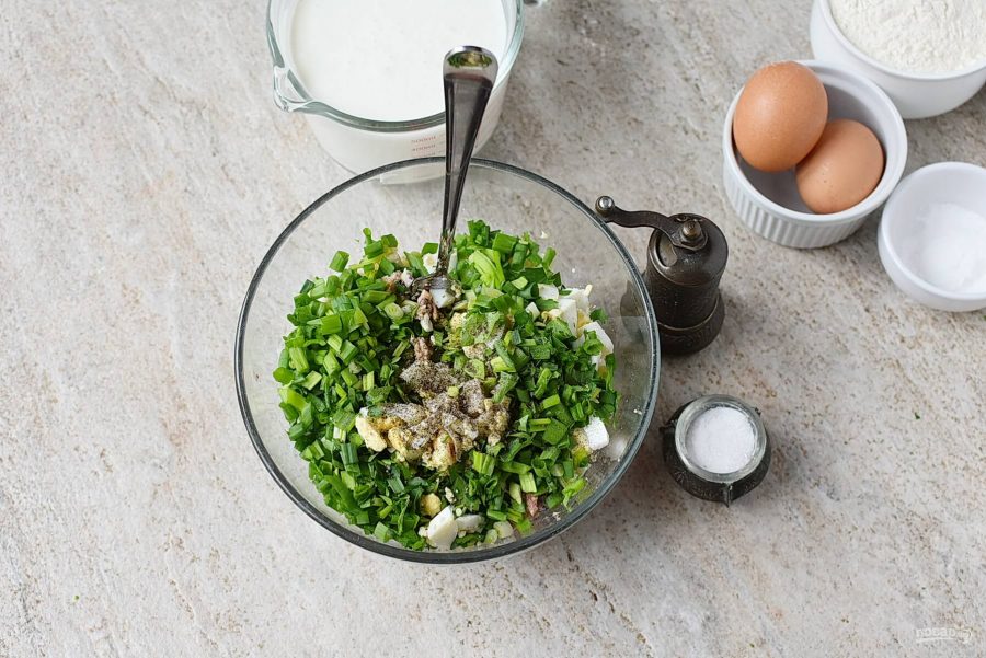 Подготовьте продукты для пирога. Яйца для начинки нарубите, луку и петрушку мелко