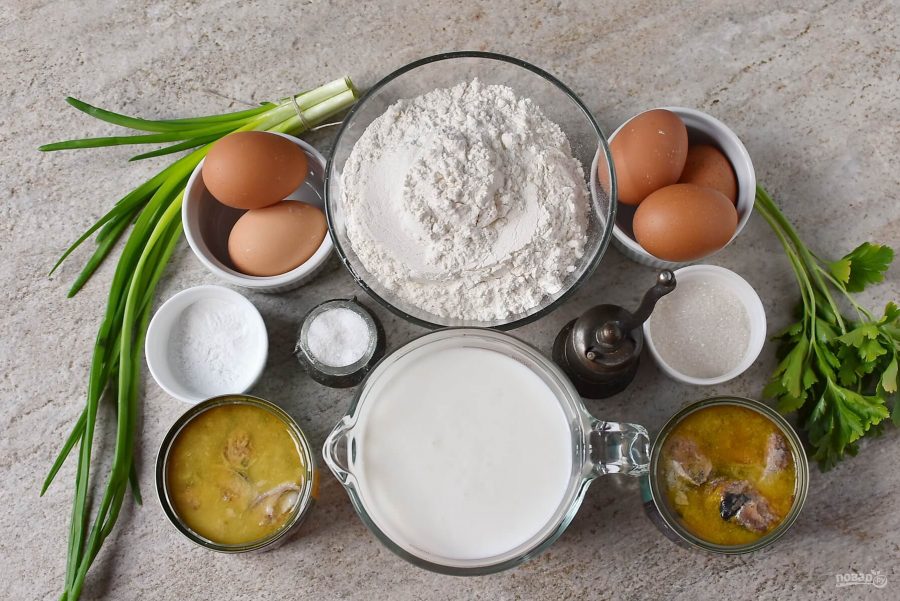 Чтобы заливное тесто на кефире вышло удачным, необходимо, чтобы все продукты были комнатной температуры. Кефир берите нормальной жирности, обезжиренный не подойдет. Разрыхлитель можно при желании заменить пищевой содой в количестве 1/3 чайной ложки. Рыбные консервы можно брать любые, по вашему вкусу. Однако консервы в собственном соку предпочтительнее. И необходимо хорошо обсушить зеленый лук и петрушку. И ваш пирог будет самым вкусным и румяным!Состав / Ингредиенты: